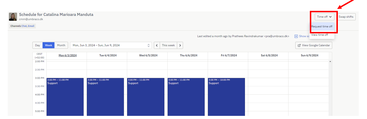 On Assembled, you can view your schedule, see your colleagues’ schedules, and request time off. You can navigate using the options in the upper left corner.